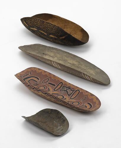 The Pintupi use a range of skills to exploit the resources available to them, and they incorporate new materials and influences into their cultural practices. The metal piti (digging dish) has been made in the same shape as the traditional wooden ones reflecting the significance and usefulness of both the design and tool.