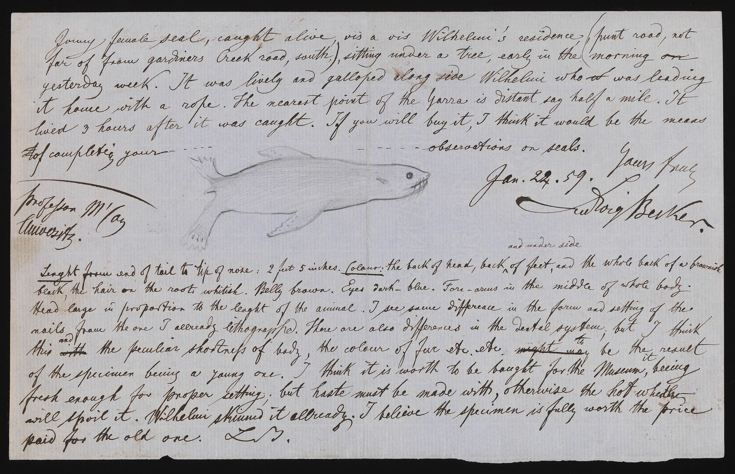 The Prodromus also included three species of marine mammals. The Australian Fur Seal was unique in receiving two entries, the first based on a young animal located near Punt Road by artist Ludwig Becker. The second was created following one of McCoy's rare field trips, when he traveled to Philip Island to observe the species and collect a representative male, female and juvenile.