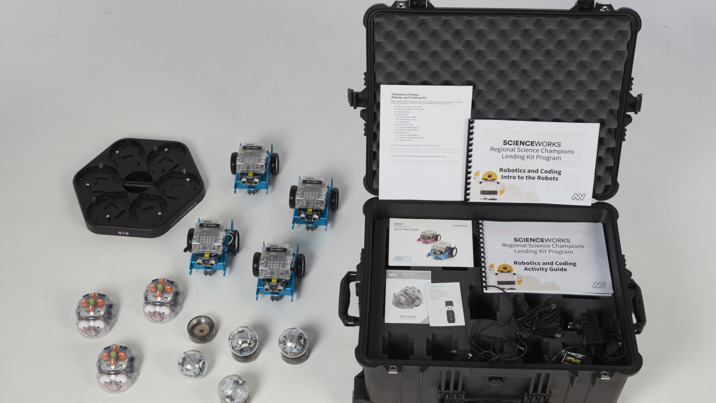 The kit contains three Blue-Bot robots, four mBots and four Spheros*. They have varying levels of complexity, and are a perfect way to explore some simple robots without having to invest in a whole lot of new tech. The kit also contains some guided STEM activities for you to help scaffold the learning and fun for your participants.