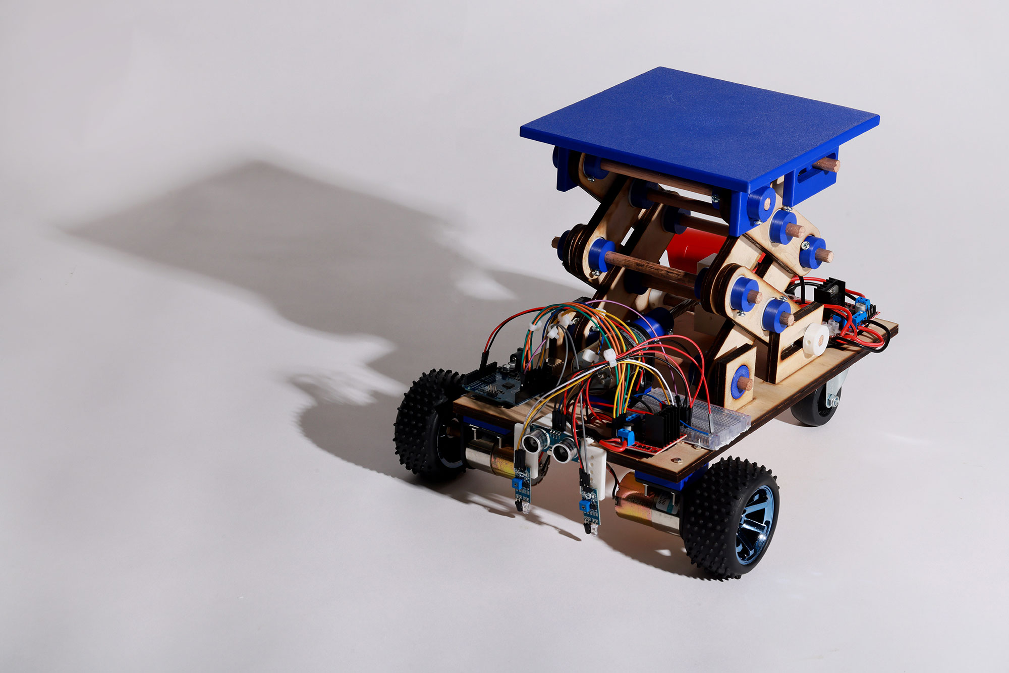 DC motors, wheels, ultrasonic sensors, Infrared (IR) sensors, lead screw, Arduino Uno, lithium-ion battery, Polyethylene Terephthalate Glycol (PETG) 3D-printed components, laser-cut plywood components