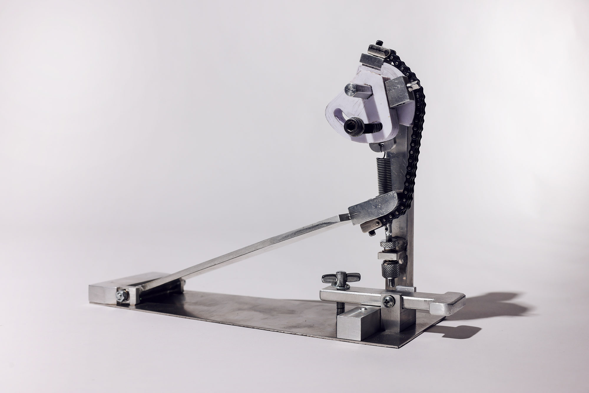 A custom Bass Drum Pedal with unique design features such as a 3D-printed cam and beater holder aims to reduce production costs. It features an adjustable beater angle system, adjustable chain length and interchangeable cam which enable near-endless configurations for personal set up preferences.