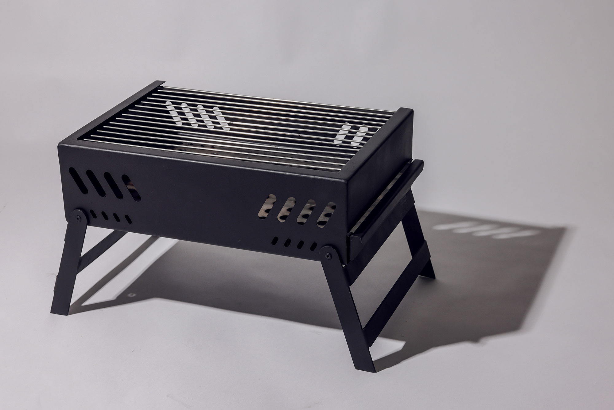 This project is a coal barbecue designed to withstand high temperatures while still being convenient. It has strong, durable legs that keep the assembly stable, but can be folded and carried with a handle, allowing it to be used in any location. It has a slide-out tray for easy access to coals, and a grill piece that can also be removed for cleaning. Because this barbecue is portable, it is perfect for camping, or even just for use in your own backyard.