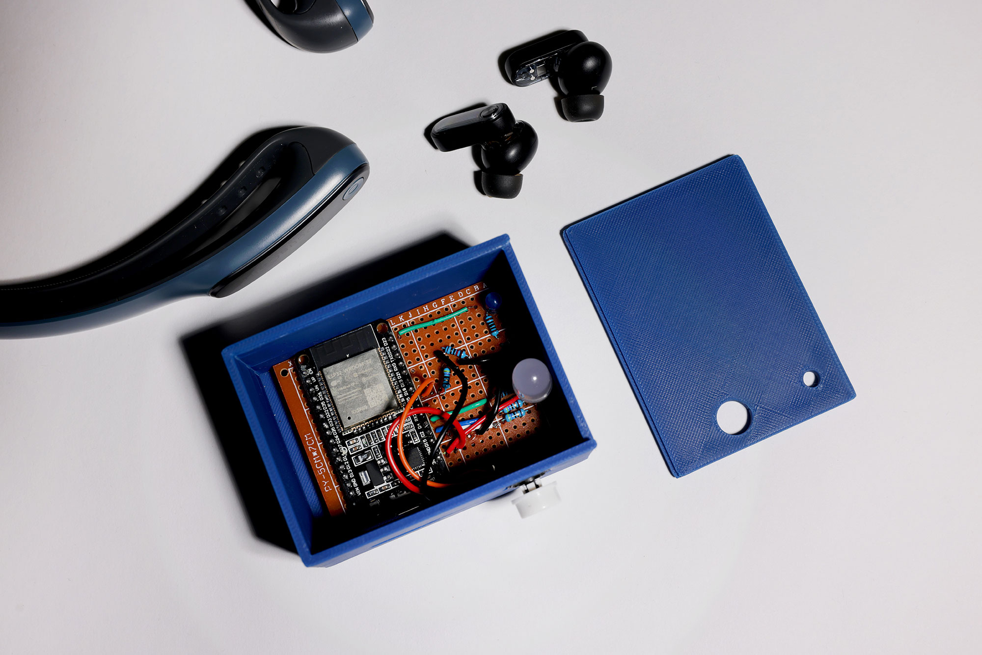 ESP32 Microcontroller, brain-computer interface (BCI) headband, NUC computer, Bluetooth earbuds, 3D-printed components, electrical components