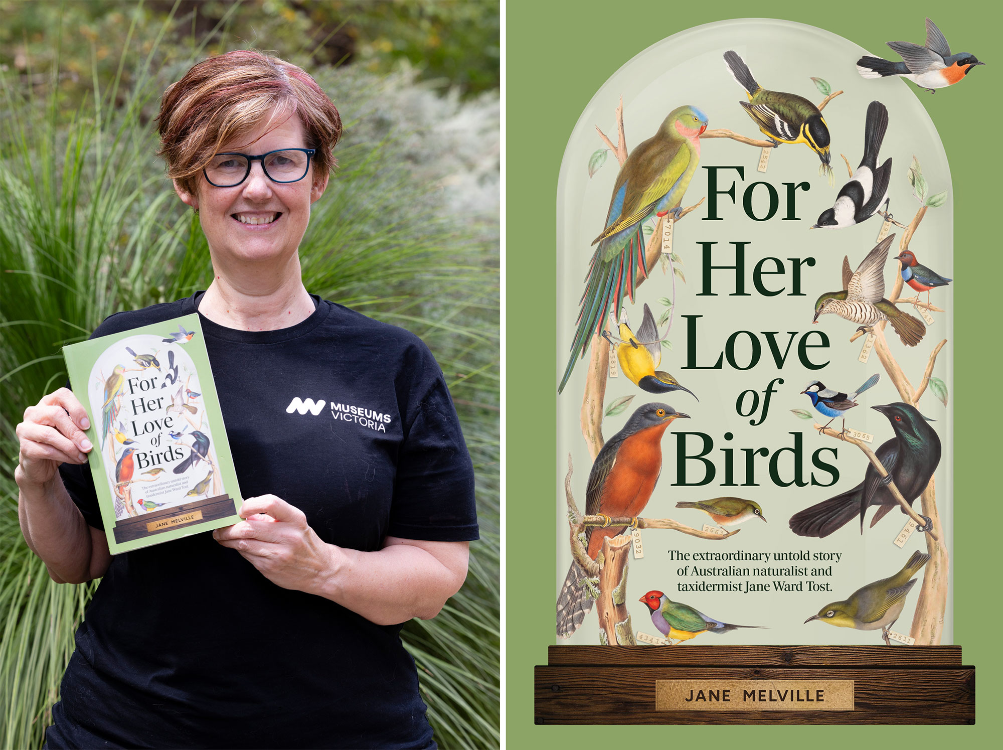 Dr Jane Melville with her new book: For Her Love of Birds: The Extraordinary Untold Story of Naturalist and Taxidermist Jane Ward Tost (left) and the publication (right)